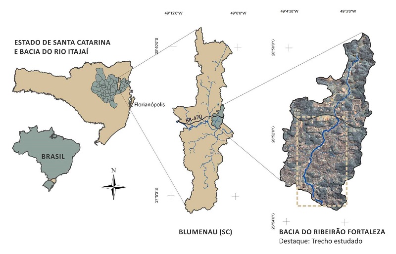 A bacia do Ribeirão Fortaleza, sub-bacia da bacia do Rio Itajaí, possui uma área de drenagem de 13,33 km2, totalmente inserida em território blumenauense (Figura 4).