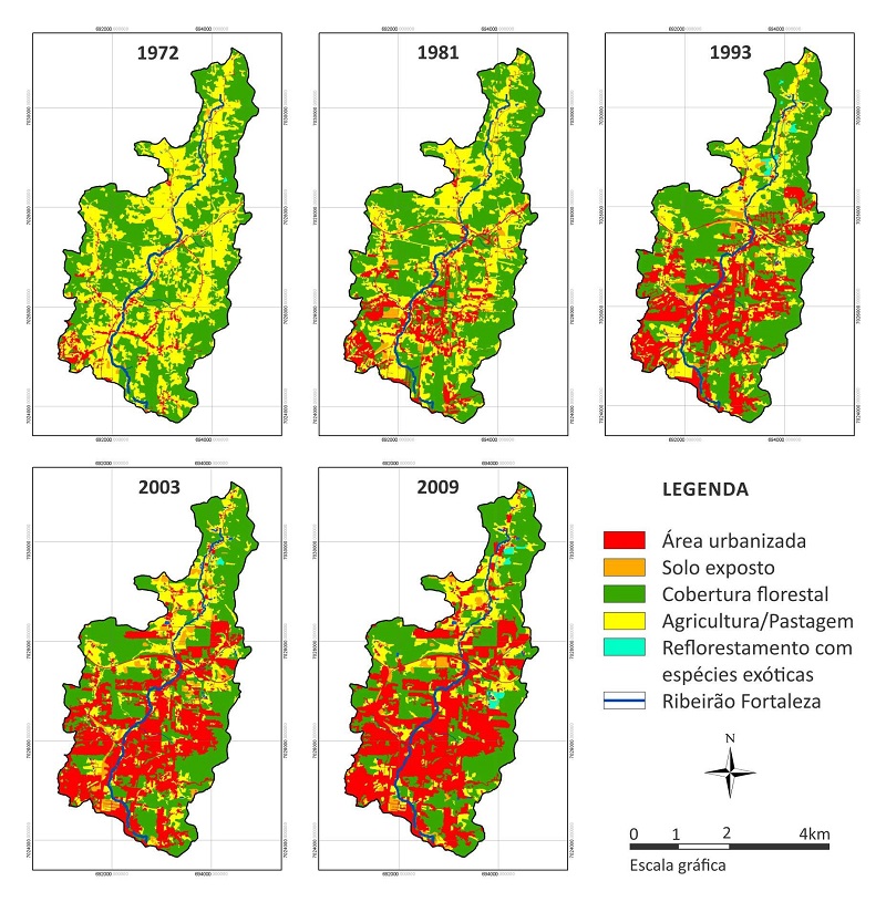 Nas últimas décadas, a bacia do Ribeirão Fortaleza tem ganhado destaque no desenvolvimento da cidade, classificando-se entre as áreas de maior crescimento. Em um período de 37 anos, as áreas urbanizadas da Bacia — representada pela cor vermelha nos mapas da Figura 5 — passaram de 76,96 ha, em 1972, para 639,39 ha, em 2009 (Rudolpho, 2012). Esse intenso processo de urbanização acarretou mudanças significativas na paisagem do Ribeirão.