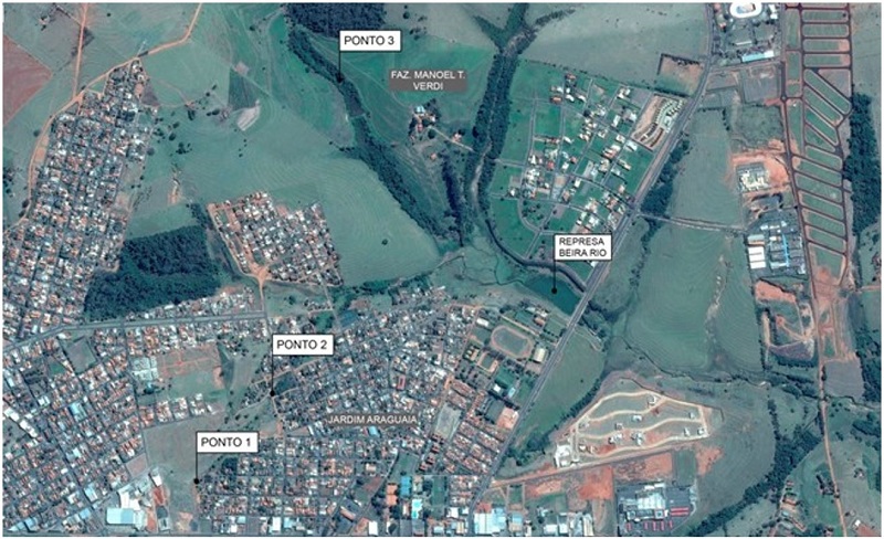 Para determinar a qualidade da água, na área objeto deste estudo, e relacioná-la com a intensidade da ação antrópica, foram realizadas análises laboratoriais de ensaios físico-químicos e ensaios microbiológicos. Para a coleta das amostras, o critério adotado foi realizar a coleta em três pontos distintos, com características diferentes quanto à intensidade da intervenção antrópica. O primeiro ponto de coleta escolhido foi próximo à nascente existente no Jardim Araguaia, no início da Avenida dos Tangarás. O segundo ponto de coleta foi realizado a aproximadamente 1.000 metros a jusante da nascente. O terceiro ponto de coleta foi realizado próximo à nascente, que está localizada dentro da fazenda de propriedade do sr. Manoel Terra Verdi, conforme Figura 5.