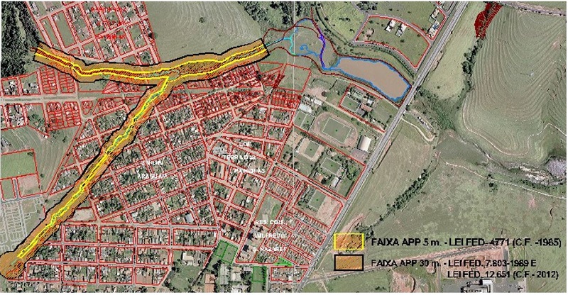 A análise da situação fundiária demonstrou uma contradição em relação à realidade encontrada no local de estudo. Quando se considera a legislação ambiental e urbanística, que determina para fins da regularização ambiental a faixa de preservação ao longo dos rios, a primeira impressão é de que o local apresenta elevado processo de invasão, pois há um grande número de edificações a poucos metros do córrego em áreas alagáveis. No período de implantação do Jardim Araguaia e do Residencial Alto das Paineiras, a legislação vigente que estabelecia a proteção da vegetação às margens dos cursos d’água era a do Código Florestal de 1965, instituído pela Lei Federal nº 4.771 (Brasil, 1965), e a extensão da área de preservação as margens dos cursos d’água era de apenas 5 metros para córregos de até 10 metros de largura. Com a aprovação da Lei Federal nº 7.803 em 1989, que alterou o Código Florestal de 1965, a faixa de proteção de 5 metros passou para 30 metros para córregos e rios de até 10 metros de largura (Brasil, 1989). E o atual Código Florestal (Brasil, 2012) também determina, para fins da regularização ambiental, a largura mínima de 30 metros de cada lado na regularização fundiária dos assentamentos inseridos em área urbana e que ocupam APPs.