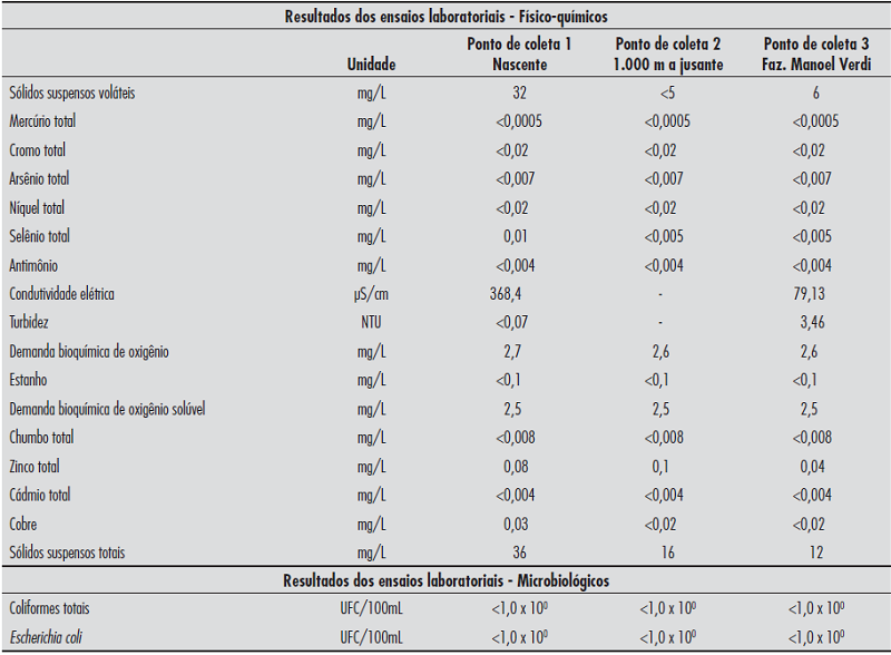 As coletas das amostras foram realizadas aproximadamente uma hora após as chuvas que ocorreram nos dias 2 de outubro de 2014 e no dia 3 de novembro de 2014. O resultado das análises laboratoriais demonstra que, no local de estudo deste trabalho, considerando a Resolução nº 357 do CONAMA (Brasil, 2005), o córrego da Aldeia pode ser classificado como classe 2, sendo permitidas a pesca amadora e a recreação de contato secundário, viabilizando, dessa forma, a criação do parque linear, sem a necessidade de grandes obras de saneamento. Os resultados estão apresentados na Tabela 1.