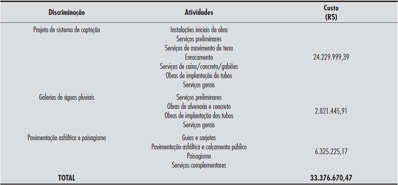 Finalmente, foi realizado um levantamento detalhado do custo de implantação do parque do córrego da Aldeia em outubro de 2010, sendo seus valores corrigidos pelo IGPM para julho de 2017, ficando estimado em R$ 33.376.670,47 (Tabela 2).