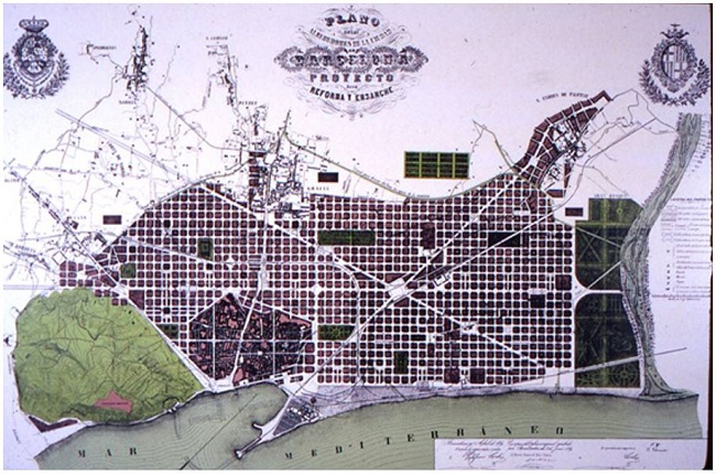 A construção inicial de San Martín é caracterizada por sua riqueza agrícola e pela topografia quase plana. Em 1855, no levantamento topográfico de Ildefonso Cerdá para a proposição do Eixample, projeto que previa a expansão da cidade, já havia a identificação de que essa área era formada por quatro núcleos urbanos independentes de Barcelona ( Figura 1 ). Nesse momento, o antigo parcelamento agrícola lentamente começou a ceder espaço para a ocupação industrial e para o aumento populacional. Essas alterações foram aceleradas pela instalação da estrutura ferroviária, em 1845. Em pouco tempo, Sant Martín passou a caracterizar-se como local produtivo de Barcelona que, apesar de sua centralidade, encontrava-se marginal em relação a cidade ( Sabaté, 1997 ).