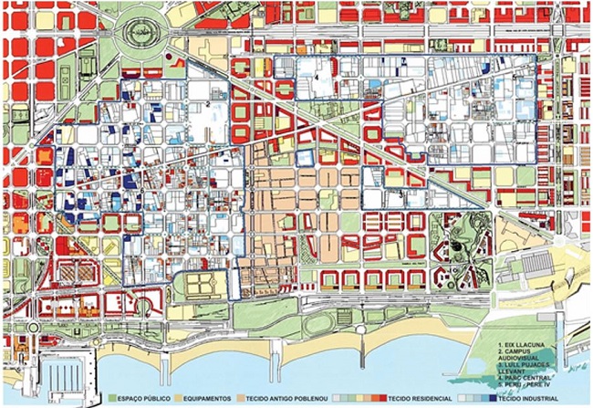 Portanto, o âmbito dessas operações tem por objetivos desenvolver áreas sensíveis no Poblenou, capazes de atuar como “motores do processo de transformação do bairro”; outorgar coerência e unidade dos tecidos e espaços em cada setor; assegurar a confluência de diversos usos, garantindo uma complexidade funcional mínima; promover continuidade aos tecidos residenciais, como forma de garantir a apropriação social do espaço; promover riqueza espacial e tipológica; e desenvolver, em cada setor suas vocações específicas em função de sua localização no tecido urbano ( Barcelona, 2012 ).