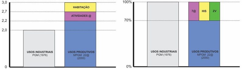 O Plano 22@ pauta-se no incentivo da diversidade de usos e tipologias arquitetônicas e na complexidade da área. Portanto, o incremento do potencial construtivo também está vinculado à previsão de no mínimo 20% de atividades @ em seus programas funcionais ( Barcelona, 2012 ). Essas atividades produtivas se caracterizam como não contaminantes e incômodas, que apresentam uso intensivo de tecnologia da informação e comunicação e vagas de trabalho altamente qualificadas, fomentando a consolidação de um setor inovador. Incluem atividades de pesquisa, desenho, edição, cultura, gestão de base de dados ou atividades multimídia. Todas têm em comum o uso intensivo do espaço, da informação e da comunicação e pessoas qualificadas que buscam entornos de qualidade, infraestruturas e espaços especializados e flexíveis. Nesse sentido, a estratégia de transformação fundamenta-se no fato de que promotores devem buscar acordos com empresas inovadoras para construção de espaços que atendam suas necessidades, aproveitando-se do aumento da edificabilidade, ao mesmo tempo em que colaboram com o desenvolvimento do processo de transformação da área.
