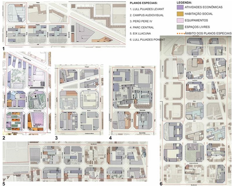 Foram definidos, ao todo, seis Planos Especiais 5 , que se propõem a atuar sobre eixos urbanos e áreas identificadas como estratégicas, em coerência com os critérios aprovados no Plano 22@ ( Figura 7 ).