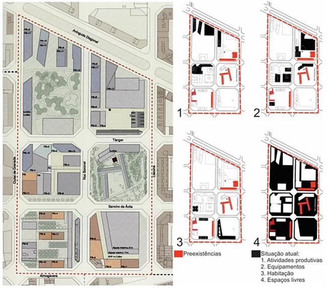 Segundo a administração pública, ao se desenvolver a proposta do plano, a primeira questão a ser considerada foi a ordenação do tema da propriedade, em um sistema que garantisse, a partir do reordenamento fundiário, os direitos aos proprietários, por meio da previsão de novas parcelas de terra, indenização econômica ou novas habitações ( Barcelona, 2011 ). Nesse sentido, a riqueza desse suporte territorial, formado por camadas de origem agrícola, industrial e posteriormente incorporados à trama Cerdá, constituiu elemento fundamental à proposição da diversidade morfológica do plano, ao incorporar inúmeras preexistências resultantes da memória de formação e ocupação do bairro.