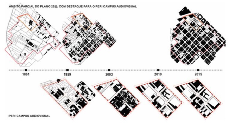 Outro componente responsável pela flexibilidade morfológica diz respeito a organização fundiária, elemento fundamental no processo de transformação territorial. Na área do PERI Campus Audio Visual, por exemplo, a reorganização da antiga malha agrícola nas estruturas do Plano Cerdá já era observada no ano de 1929. A partir dessa data, e no momento de aprovação do Plano 22@, em 2000, verifica-se que a estrutura fundiária era conformada por quadras de dimensões maiores e pela presença de diversas edificações remanescentes do passado industrial do Poblenou ( Figura 10 ).