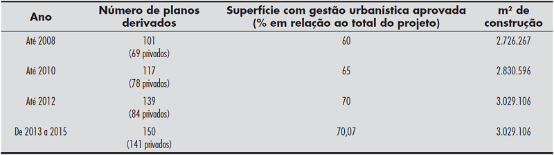 Ao final de 2015, 70,07% do território encontrava-se com gestão urbanística aprovada, sendo que 50,60% do solo 22@ encontra-se com a transformação pendente, a ser completada, conforme demonstra a Tabela 1 ( Barcelona, 2015 ).