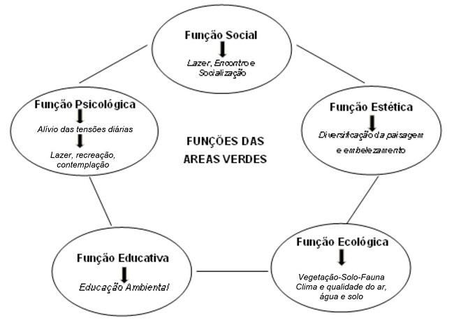 Bargos (2010) admite que as áreas verdes tendam a assumir diferentes papéis na sociedade e suas funções devem estar inter-relacionadas no ambiente urbano, de acordo com o tipo de uso a que se destinam ( Figura 1 ).