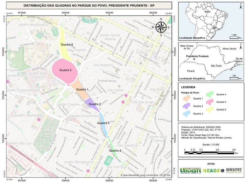 As áreas-alvo em que as observações se iniciaram foram aquelas com maior fluxo de pessoas, conforme orientado pelo manual de utilização do instrumento. A partir disso, respeitou-se o sentido horário, sendo completada uma quadra de cada vez. Para facilitar a apresentação dos resultados, as 32 áreas-alvo foram agrupadas em 6 quadras, conforme pode ser observado na Figura 3 .