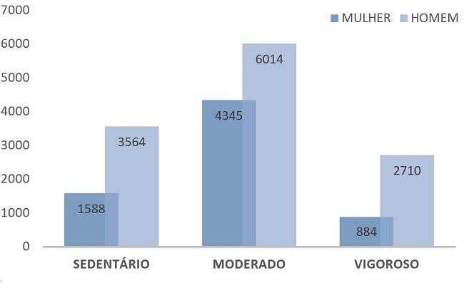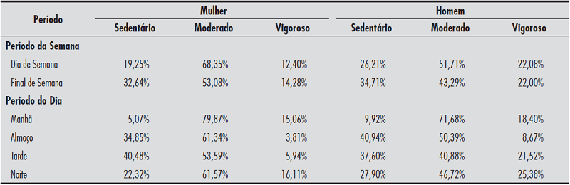 As atividades moderadas prevaleceram em todos os períodos do dia, e as atividades vigorosas foram mais frequentes no período da noite em ambos os sexos.