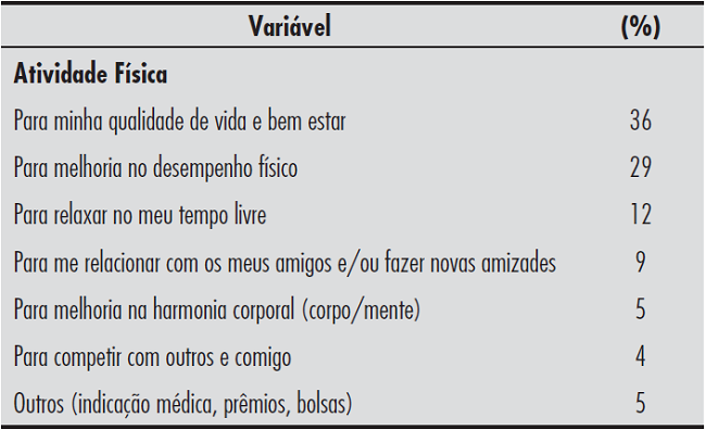 Quanto às motivações para a prática de AF, a pesquisa mostrou que a qualidade de vida e bem-estar são os maiores responsáveis pela busca de uma vida ativa ( Tabela 1 ).