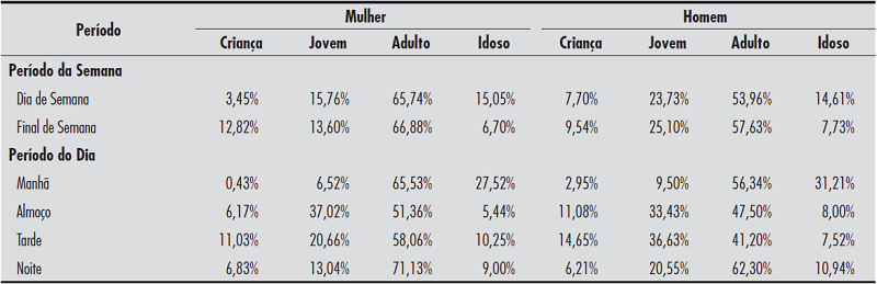 As diferentes faixas etárias estiveram mais presentes em períodos do dia alternados. Os idosos fizeram uso do parque com mais frequência no período da manhã, os adolescentes foram mais presentes no meio do dia, as crianças no período da tarde e os adultos no período da noite ( Tabela 3 ).