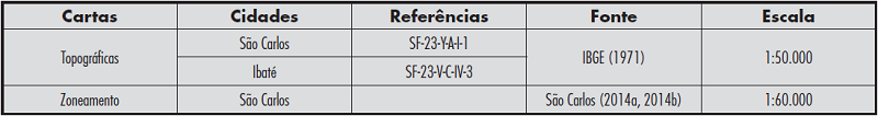 Foram utilizados os seguintes produtos cartográficos: a) carta topográfica do município de São Carlos de 1971; b) Imagens Thematic Mapper - TM LANDSAT 5 e 8 sensor Operational Land Imager (OLI), sendo as bandas espectrais do TM: 3 (vermelho), 4 (infravermelho) e 5 (infravermelho-médio), com resolução espacial de 30 m; c) dados de shapefile do município de São Carlos, da área urbana e do recorte da área de estudos; d) dados de shapefile da rede hidrográfica, das rodovias e das ferrovias.