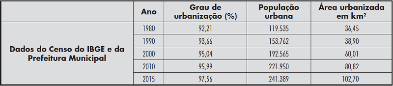 Os dados relativos aos períodos anteriores indicam parte desse crescimento. Em 1980, o município possuía 37,74 km2 de área urbana, conforme dados obtidos por meio das imagens de satélite, e uma população, segundo Censo do IBGE, de 119.535 mil habitantes. Já na década de 1990, a área urbana era de 38,86 km2, e a população, de 158.221 mil habitantes; ou seja, a área urbanizada cresceu em torno de 11,21 km2 e a população teve um aumento de 38.686 mil habitantes. No período destacado, enquanto a área urbanizada cresceu pouco mais de 10%, a população cresceu quase 35%.