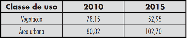Outro fator preponderante é a perda da vegetação nativa. A Figura 2 representa a classe de uso vegetação e a respectiva área urbana de 2010 e 2015. O Quadro 3 apresenta o crescimento da área urbana e a perda de vegetação no período. O uso de imagens e de técnicas de interpretação auxiliou na construção da análise de perda da vegetação durante o período, totalizando, aproximadamente, 25,2 km2 de área.