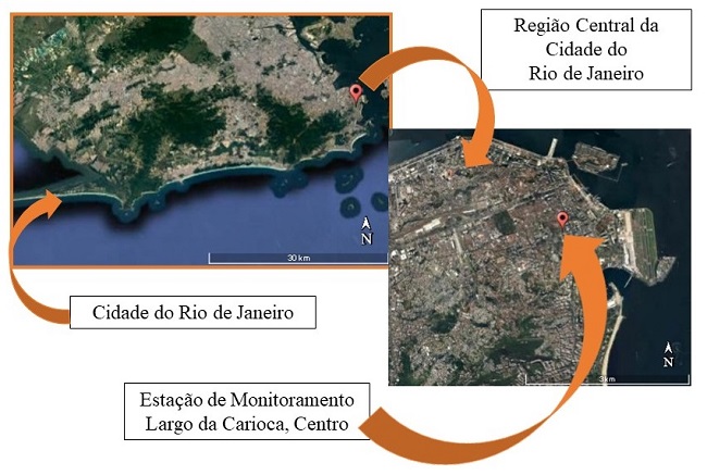 A Figura 1 mostra a cidade do Rio de Janeiro, o bairro Centro e vizinhanças e a estação de monitoramento do Largo da Carioca. A estação Largo da Carioca é próxima à região portuária e ao Aeroporto Santos Dumont, assim como a importantes centros culturais, por exemplo, Teatro Municipal, Museu do Amanhã, Museu Histórico Nacional, Catedral Metropolitana e importantes avenidas com intenso trânsito veicular e circulação de pessoas.