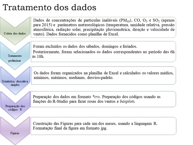 A organização dos dados e o tratamento preliminar, usando estatística descritiva (valor médio, mediana, desvio-padrão, mínimo e máximo), foram realizados com Microsoft Excel, por meio das funções disponíveis nesse aplicativo. O tratamento posterior dos dados foi efetuado mediante a linguagem de programação R-Project ( R Core Team, 2017 ), que permite a análise estatística e a construção de diferentes gráficos. O R é um software livre para estatística e construção de gráficos, que oferece recursos para diversas áreas, com uma série de comandos e funções que permitem construir diferentes gráficos, como boxplots e rosa dos ventos, além de realizar cálculos de estatística descritiva e multivariada. Neste trabalho, foi usado o ambiente R-Studio ( R Core Team, 2017 ), por meio do qual é possível escrever códigos, com uma série de comandos que permitiram ler os dados e elaborar as diferentes figuras. Os dados foram organizados em uma planilha de Excel, no formato *cvs. Foram traçados as rosas dos ventos e os perfis de concentração dos poluentes monitorados e dos parâmetros meteorológicos para os quatro meses estudados. As figuras foram construídas na forma de boxplot, uma apresentação muito conveniente porque permite a visualização das medianas, dos valores mais prováveis (por intermédio da indicação do primeiro e terceiro quartis, Q1 e Q3, respectivamente), dos mínimos (dentro de 1,5 do menor quartil), máximos (dentro de 1,5 do maior quartil), extremos e outliers ( Miller & Miller, 2010 ). Neste trabalho, o tamanho da caixa é o comprimento interquartil (IQR = Q3-Q1), e a mediana é indicada com uma linha preta dentro da caixa. Os whiskers se estendem entre o mínimo e o máximo, e os outliers são indicados com círculos.