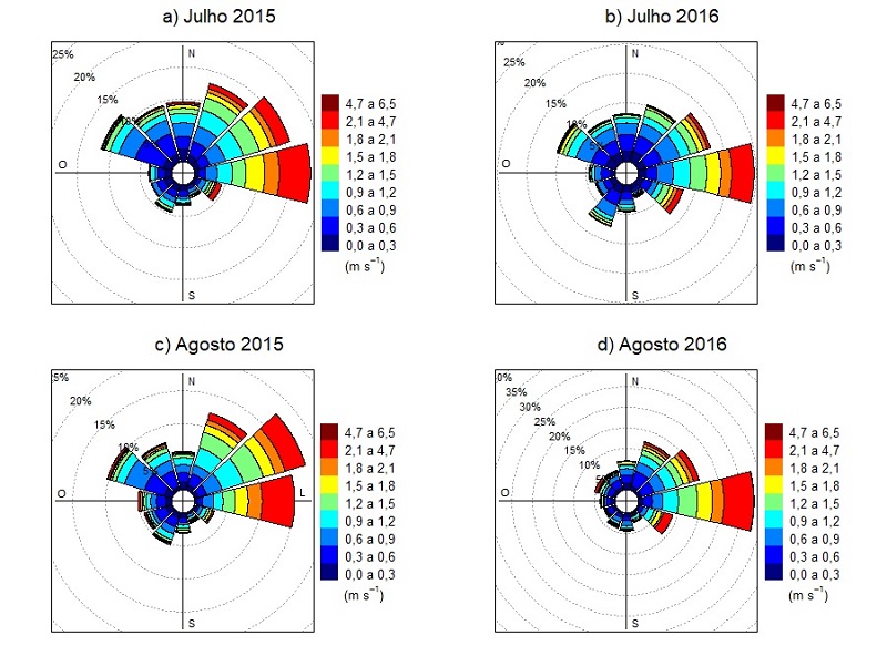Inicialmente, foram traçadas as rosas dos ventos para os quatro meses estudados (julho de 2015 e 2016 e agosto de 2015 e 2016), no período das 6h às 18h, tal como apresentado na Figura 3 .