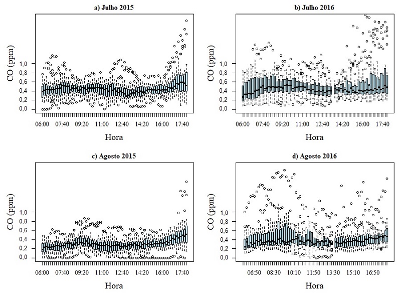 As concentrações de CO são apresentadas na Figura 4 . Os padrões primário e secundário para o CO foram 9 ppm para 8 horas e 35 ppm para 1 hora ( Brasil, 1990 ). Já o IQA utilizado no Estado de Rio de Janeiro foi Bom e Regular nas faixas 0-4,5 ppm e 4,5-9,0 ppm, respectivamente. Assim ao considerar esse poluente, tanto as medianas como os valores máximos foram muito menores que os padrões de qualidade do ar e corresponderam a um IQA Bom. Nos meses de julho de 2015 e julho de 2016, observaram-se os maiores máximos no final da tarde. Os menores valores foram observados em agosto de 2015, enquanto os maiores valores, especialmente máximos, foram percebidos em agosto de 2016.