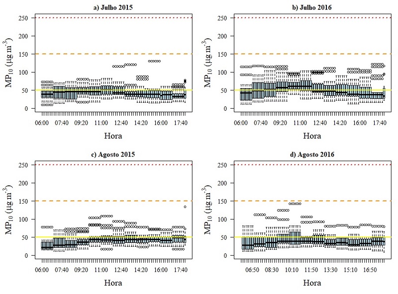 Tanto as medianas como os valores máximos de concentração de PM 10 foram menores que o padrão de qualidade do ar para 24 horas. Porém, o valor de 50 μg m-3 (que correspondia ao IQA Regular) foi superado em todos os meses. Pode ser observado que as concentrações nos meses de julho e agosto de 2015 foram, na maior parte dos horários, menores que nos mesmos meses de 2016. No ano de 2016, em geral, as menores concentrações (medianas) foram encontradas no mês agosto, no qual foram realizados os Jogos Olímpicos.
