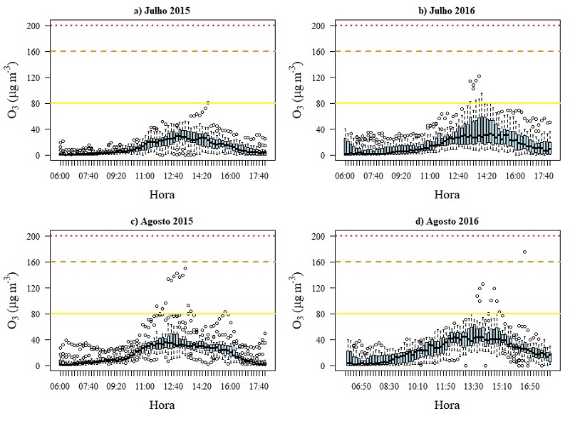 As concentrações medianas de ozônio para 1 hora permaneceram na faixa de IQA Bom, porém as médias de 1 hora para alguns horários ultrapassaram o valor de 80 μg m-3, especialmente no ano de 2016. Por ser um poluente secundário, formado por meio da oxidação fotoquímica dos Compostos Orgânicos Voláteis (COVs) na presença de óxidos de nitrogênio, NO + NO2, (NOx), em geral, o máximo para as concentrações se encontra aproximadamente a 1 PM e 3 PM. Os menores valores para as medianas foram para julho de 2015 e 2016, não tendo uma diferença significativa entre julho 2015-2016. Os valores para agosto foram os maiores que os de julho e ainda maiores em 2016.