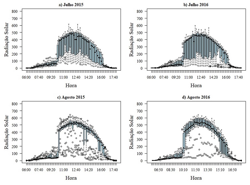 Como também apresentado na Figura 7 , ao comparar os meses de agosto de 2015 e agosto de 2016, houve uma maior incidência de dias com radiação solar mais intensa em agosto de 2016 e com uma mediana da radiação solar (para o horário de máxima insolação) ligeiramente maior que a do mês de agosto de 2015.
