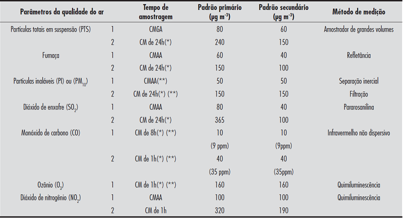 No Brasil, em âmbito federal, a Resolução CONAMA nº 03/90 define padrões primários e secundários de qualidade do ar para alguns parâmetros – partículas totais em suspensão, partículas inaláveis, dióxido de enxofre, monóxido de carbono, ozônio, dióxido de nitrogênio e fumaça. Os padrões primários e secundários são determinados a fim de garantir, respectivamente, a saúde e o bem-estar da população, bem como a preservação do meio ambiente ( Brasil, 1990 ).