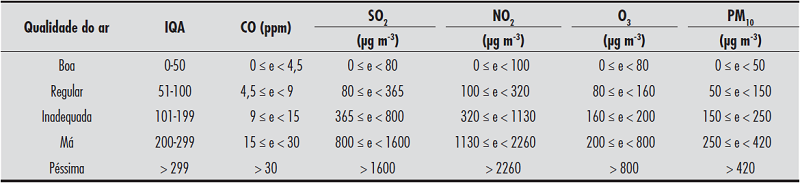 Posteriormente, foram analisadas as concentrações dos poluentes monitorados nos quatro meses definidos. Para isso, foram considerados os padrões nacionais de qualidade do ar, estabelecidos por meio da Resolução CONAMA ( Brasil, 1990 ) e apresentados na Tabela 1 , e os Índices de Qualidade do Ar (IQA), determinados pela CETESB (2015) e adotados também no Estado do Rio de Janeiro ( Tabela 2 ).