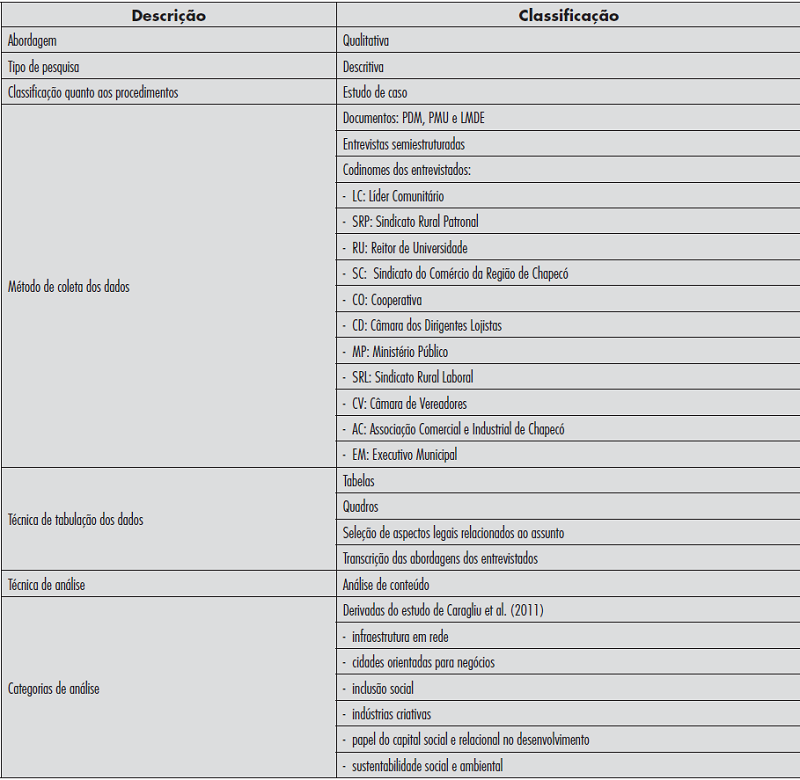 Os aspectos conceituais inspiram algumas proposições: como construir uma cidade inteligente e criativa? O que a cidade já possui e se alinha às premissas de cidade inteligente e criativa? O que falta para Chapecó ser inteligente e criativa? O objetivo proposto foi verificar os aspectos legais e o ponto de vista de lideranças sobre a perspectiva da formação de uma cidade inteligente e criativa com base nos pressupostos de Caragliu et al. (2011) .