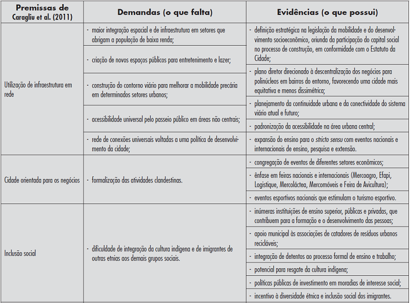 Por fim, a partir da triangulação da legislação municipal, das entrevistas e do aporte teórico, elaborou-se a síntese das principais demandas (o que falta) e evidências (o que possui) para Chapecó como cidade inteligente e criativa, exposta no Quadro 2 .