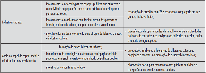 Isso posto, para a materialização de cidades inteligentes e criativas, além das manifestações expostas, os entrevistados abordaram: a inclusão de detentos por meio de instituições de ensino superior e empresas na penitenciária; a infraestrutura de redes móveis de telecomunicações em ambientes públicos destinados ao lazer, visando à promoção de uma cidade humanizada e inclusiva; e a criação de aplicativo para comunicação instantânea de problemas urbanos entre os cidadãos e os gestores públicos municipais, tornando mais ágeis os processos de tomada de decisão.