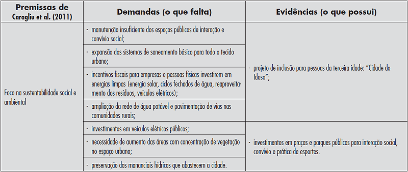 Índices construtivos menos severos contribuem para a sustentabilidade ambiental urbana a partir da manutenção do abastecimento de água e da distribuição de áreas verdes de forma progressiva, além de aferir qualidade ambiental urbana ( Caragliu et al., 2011 ). O capital social e relacional está vinculado à capacidade de articulação entre as diferentes instâncias representativas da sociedade. Em Chapecó, além da governança conjugada, existe a gestão urbana e territorial por meio dos instrumentos de participação popular, como consultas e audiências públicas, e a conferência da cidade ( Chapecó, 2014 ).