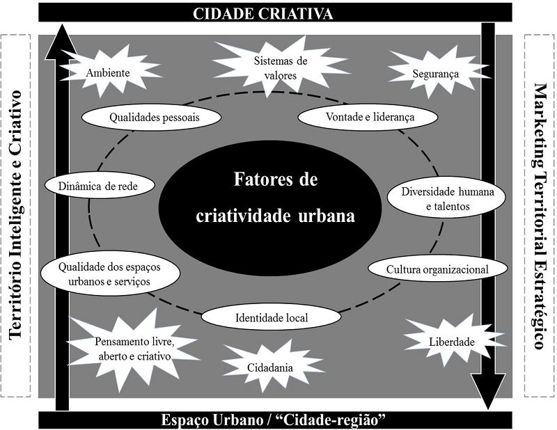 A criatividade não pode apenas ser analisada em um quadro conceitual e individualizado, associado à classe criativa e às indústrias criativas, mas sim de uma forma integrada com a componente territorial ( Landry, 2003 ; Costa et al., 2009 ; Fernandes, 2015 ). Nesse sentido, é central perceber de que forma o desenvolvimento de uma economia criativa pode estar tacitamente associado aos territórios. O ciclo da criatividade urbana defendido por Landry (2003) expõe o elo de ligação entre a criatividade e sua exploração e o aproveitamento para o desenvolvimento de um lugar (cidade ou região), sublinhando a necessidade de adaptabilidade ao espaço e de gestão inteligente e coerente dos fatores de criatividade.