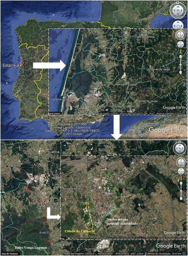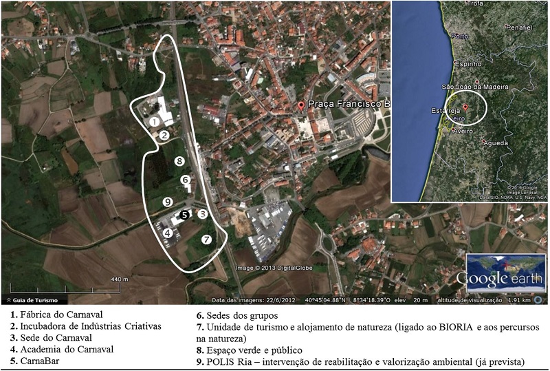 Em uma primeira abordagem, para além da “arquitetura” institucional, funcional e econômica da “cidade do carnaval”, é importante fazer um exercício de espacialização das infraestruturas e da forma de distribuição dos agentes e equipamentos associados. A localização indicada confina-se a um espaço a poente da cidade de Estarreja, separado pela ferrovia do Norte e voltada para o Baixo Vouga Lagunar. Essa área é considerada, nos últimos 10 anos, como um setor de “transição” parcialmente abrangido por reserva agrícola e ecológica nacional, com um enquadramento de edificado devoluto e espaço urbano desqualificado. Essa localização pretende solidificar a malha urbana, estender a centralidade, voltá-la para o contexto natural e criar uma nova centralidade, afirmando territorialmente a sua marca no quadro das indústrias criativas, do desenvolvimento econômico e ambiente natural.