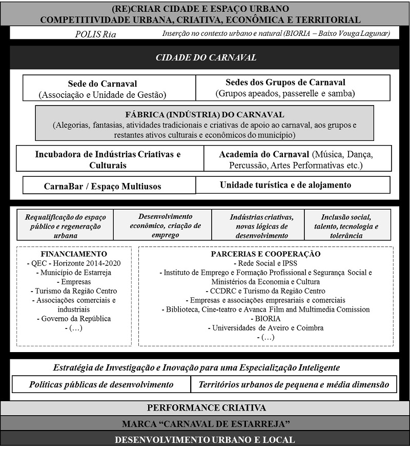 Independentemente da dinâmica endógena do próprio carnaval de Estarreja, a meta principal é estruturá-lo, enquadrando-o em uma rede de agentes criativos do município como uma das âncoras do desenvolvimento da criatividade. É importante valorizar a vertente econômica e social, perspectivando-se a sua conversão em uma grande indústria criativa com capacidade de criação de valor acrescentado. Pensando nos incentivos europeus das políticas públicas para 2014-2020, na estratégia de especialização inteligente e em um modelo ancorado em políticas ajustadas às indústrias criativas em território local/regional, é importante apontar algumas soluções e estratégias de desenvolvimento, como é o caso do projeto estruturado na ideia e no conceito da “cidade do carnaval de Estarreja” ( Figura 6 ). Esses alicerces estratégicos assentam-se na ideia relacionada com a potencialização da marca de “Estarreja” associada ao carnaval, promovendo o desenvolvimento local e regional e a sua projeção nacional e internacional, em uma ligação permanente com pressupostos de inclusão social, oferta de emprego, desenvolvimento econômico e regeneração urbana.