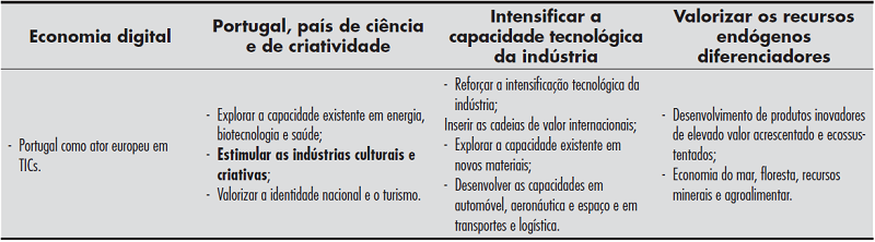 Nesse quadro, a nova Política de Coesão da União Europeia (2014-2020) centra-se na denominada especialização inteligente como umas das preocupações principais na promoção da recuperação econômica da Europa ( Foray, 2015 ; McCann & Ortega-Argilés, 2015 ; Morgan, 2015 ; Carayannis & Grigoroudis, 2016 ; Kyriakou et al., 2016 ; McCann et al., 2016 ). As orientações para a política pública são equacionadas para um horizonte/período até 2020 (Horizonte 2020), organizando-se em estratégias e medidas nacionais (Portugal 2020 ) e regionais (programas operacionais regionais, no caso de específico de Estarreja associado ao Programa Operacional da Região Centro de Portugal – Centro 2020). Tendo em conta os diferentes pilares da estratégia, a especialização inteligente surge no intuito de enquadrar as prioridades no potencial de desenvolvimento endógeno dos espaços territoriais nacionais e regionais ( ENEI, 2014 ). Para além das dimensões associadas ao fomento das TICs, da inovação, da ciência, da tecnologia, das atividades industriais e de um conjunto de recursos endógenos, a Estratégia de Investigação e Inovação para uma Especialização Inteligente visa, especificamente no seu segundo pilar, estimular as indústrias culturais e criativas em uma dimensão socioeconômica e territorial ( Tabela 1 ). A forma como os territórios têm reagido às grandes alterações econômicas, sociais e empresariais reforça a necessidade de redirecionamento das estratégias no sentido de um crescimento “inteligente”, ancorado em uma economia do conhecimento, da inovação e da criatividade ( Foray, 2015 ; McCann & Ortega-Argilés, 2015 ; Morgan, 2015 ; McCann et al., 2016 ).