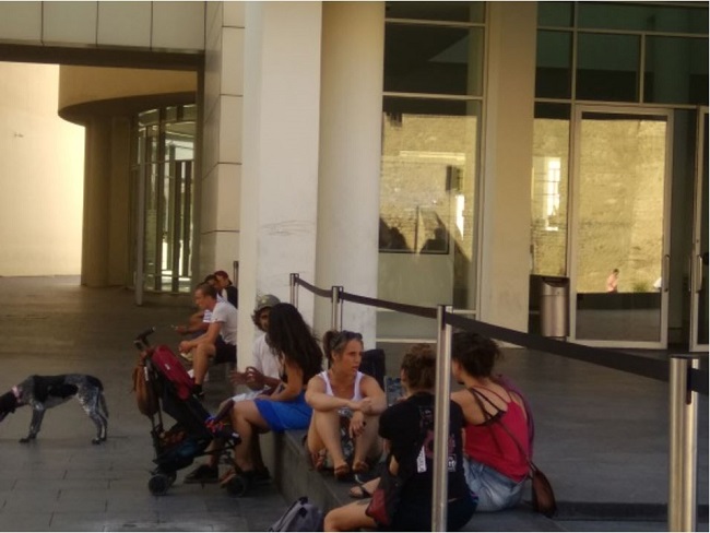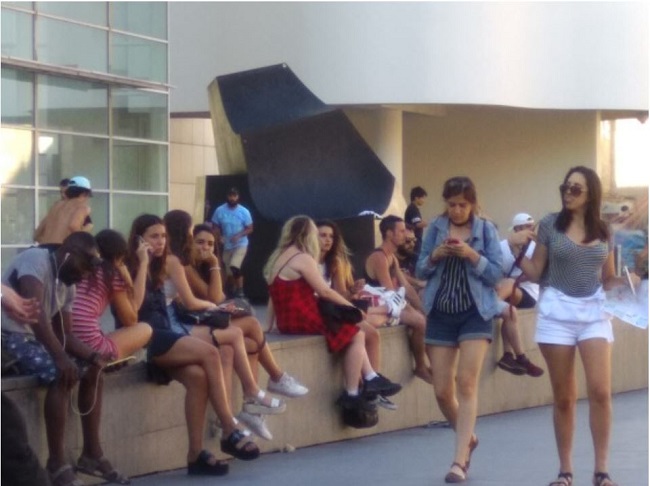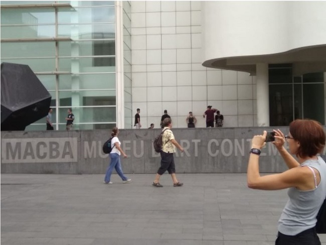 Tres: ‘Turistas’. La estancia de este colectivo ( Figura 8 ) en la plaza se ceñía a media hora como máximo; tomaban la plaza como un lugar donde recobrar el ánimo después de sus caminatas: “Por nada en especial. Estamos cansado. Hace mucho calor. Y aquí hay la sombra” (I, 16/09/2017). Solían sentarse en las rampas de acceso al museo, evitando a los sintecho y fuera de la trayectoria de los skaters. Sin una motivación especial por visitar el museo, aprovechan para retratar el MACBA desde diversos ángulos y llevarse un recuerdo: “Un edificio muy bonito. Llama la atención… Ese blanco” (J, 28/09/2017). Dada su presencia circunstancial, algunos bares aprovechaban para promocionar brunchs y tapas. De entre todos los colectivos, éste era el único no proponían ningún desvío respecto a lo normativo. La plaza era un pasaje entre dos zonas y el punto idóneo para retratar un edificio que proponía a Barcelona como adalid de la Modernidad.