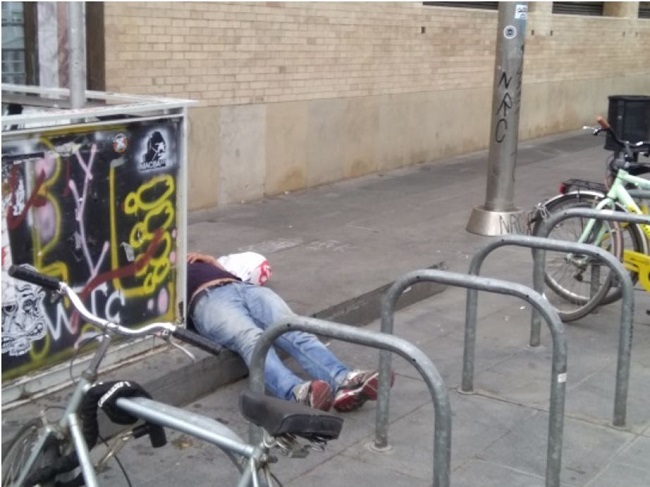Cuatro: ‘Sintecho’. En su mayoría hombre, pasan gran parte del día en la sombra ( Figura 9 ); algunos beben cervezas, otros juegan con sus perros, cantan o, las menos de las veces, piden dinero o se pelean entre ellos.