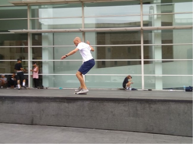 Los múltiples desniveles de la plaza se prestan a poner a prueba su destreza; en la zona central, los skaters se dedicaban a ensayar flips, hardflips y pop shove its y desviaban los peatones; en las rampas y escaleras, y cuando los guardas de seguridad no los veían, probaban kickturns , ollies, grinds, lidpslide, etc., y en ocasiones se grababan. “La plaza tiene de todo para practicar… para todos los niveles. Te encuentras de todo, cracks y aficionados. Es un sitio cojonudo” (P, 8/09/2017). Durante la etnografía distinguimos ocho grupos recurrentes de skaters, todos de distintas nacionalidad, distinta procedencia dentro de la ciudad y distinto nivel de pericia con el skate. Por las mañanas los grupos de skate se caracterizaban por ser muy jóvenes y principiantes. Por las tardes, los grupos expertos, en los que dominaba una estética pseudoamericana, tomaban paulatinamente la plaza; unos con las escaleras de Montalegre, otros circulan de la entrada del parking hasta el extremo contrario de la plaza; otros, más mayores (entrados en la treintena), se apoyaban contra la fachada del CEDM. Durante las tardes, con una territorialización muy fuerte, no había rincón libre de skaters. Por los saludos y los intercambios lingüísticos en un tosco inglés la plaza parecía el lugar de encuentro de una práctica que les entusiasmaba. Su práctica desviaba por completo los usos programados; de la funcionalidad de acceso al museo y al pasaje entre zonas, se pasaba a un conjunto de elementos en los que se podía disfrutar la ciudad como si de un half pipe se tratara.