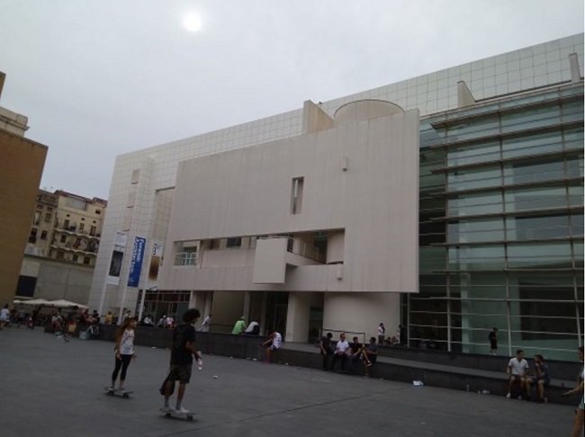 La Plaça dels Àngels conecta la calle de Ferlandina con la de Montalegre, esto es, sutura la enrevesada trama del Raval con la modernismo del Eixample. La gran extensión vacía de esta plaza dura, sin zonas verdes ni refugio durante las horas de insolación, invita a atravesarse sin gusto, a apenas vivirla como un interludio. Si cruzamos la plaza desde Ferlandina, uno se topa con la fachada de la Escola Vedruna-Àngels y el camino se bifurca en tres direcciones; si, por el contrario, venimos de Montalegre, la presencia de las rampas del museo obliga a modificar la trayectoria de nuestros pasos. De entrada, la plaza se presenta como un no-lugar [non-lieu] ( Augé, 1993 ): “Un espacio transitivo, no antropológico, donde la inscripción social es apenas realizable” (Cuaderno, 15/06/2017). A lado y lado de la senda, las referencias visuales polarizadas del Convent dels Àngels y el MACBA, lo antiguo y lo rabiosamente moderno. Ante la infradotación de elementos de reunión, como observamos durante la etnografía, el MACBA ( Figura 4 ) atrae la mirada de los transeúntes, que repercute en la percepción mental de la plaza. En el interior de la plaza, además del omnipresente gris, el servicio de bicis –Bicing– y la entrada al parking acaban de ofrecer, secundariamente, el resto de referencias visuales: