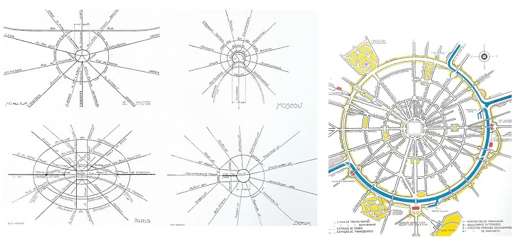 During the 1920s, other city planners stood out in the city: Francisco Prestes Maia, João Florence de Ulhoa Cintra and Luiz Ignacio Romeiro de Anhaia Mello, all of whom graduated from the Polytechnic School where they later became professors. Prestes Maia and Cintra worked together in municipal public works. Between 1922 and 1924, they published a study that would forever mark the city’s future configuration. The study was based on the works of French city planner Eugène Hénard’s (1903), Études sur les transformations de Paris, already mentioned. Prestes Maia and Cintra’s study proposed that São Paulo should adopt the radial-concentric models, from the concept of “perimètre de rayonnement”. Based on the idea that structuring the future metropolises would follow this pattern, according to the four schemes presented by Hénart for London, Paris, Moscow, and Berlin, Prestes Maia and Cintra developed the Plano de Avenidas (Plan of Avenues) for the city of São Paulo, projecting radial and perimetral avenues, including the two main rivers of the city in the model (Figure 3). The grand folio exposing this plan, illustrated with photos and watercolors, was published in 1930 and had a deep impact, given its graphic quality and a large number of references to German, British, North American, and French city planners. Nevertheless, this plan was only carried out during Prestes Maia’s terms as mayor of the city (1938-45 and 1961-65), but not without criticism from a group of city planners who followed other lines of thinking, such as Luiz de Anhaia Mello.