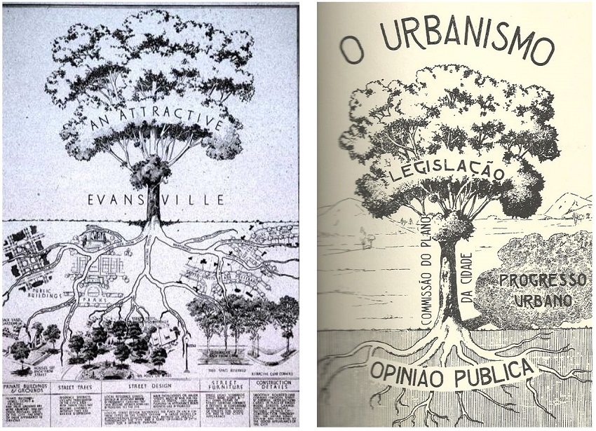 He created regular courses on City Planning (“Aesthetics, General Composition and Urbanism”) at the Polytechnic School around 1926, and in 1948, he founded the School of Architecture and Urbanism at the University of São Paulo, to distinguish engineers from architects, and connect the latter with city planners and social scientists. Throughout his entire life, he was involved in disseminating the principles of an ideal city, under a humanistic and “civic urbanism”, through an active and pedagogical series of public conferences (at the Rotary Club and the Engineers’ Institute, for instance). His speeches and numerous articles were published in periodicals of professional associations, such as the Boletim do Instituto de Engenharia, among others, and in books, such as his first, Problemas de Urbanismo, in 1929. Some of his ideals are represented on “The Urbanism Tree” image published in this book: the roots are the propaganda or “public opinion”, the trunk represents the “committees” and the tree canopy is “legislation” which resulted in the shade that represents “urban progress” (Figure 4).