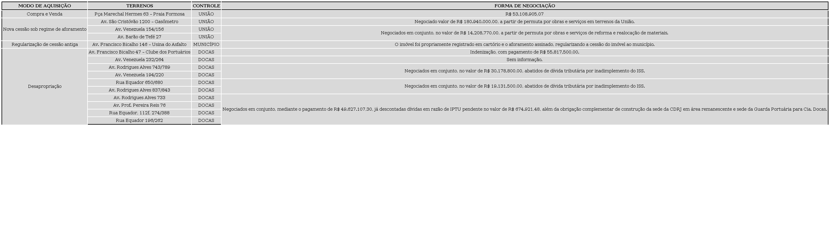 Em três casos (Avenida Rodrigues Alves 733, na Avenida Professor Pereira Reis 76 e na Rua Equador 112 fundos, 274/388 e 196/262), os processos de obtenção dos terrenos combinaram diferentes formas de pagamento, em que o valor acordado pelo domínio útil dos terrenos sofreu desconto decorrente de dívidas de IPTU e foi, ao mesmo tempo, complementado por obras e reformas em propriedades da União. Em suma, os processos de obtenção dos terrenos, vale dizer, combinaram de maneira diversa os instrumentos de aquisição e as formas de pagamento acordadas, acionando diferentes mecanismos seletivos que viabilizaram a mercantilização requerida pela OUC Porto Maravilha (Quadro 1).
