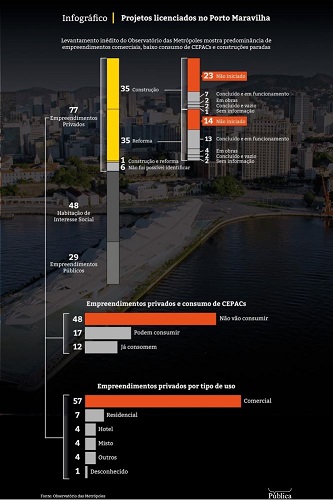 Frente a isso, os investimentos em novos empreendimentos imobiliários têm sua localização concentrada em certas áreas da região portuária, notadamente na redondeza da Praça Mauá, onde se concentram os equipamentos culturais, como o Museu do Amanhã, ou na área entre a Rodoviária e a Cidade do Samba. Isso sinaliza para um interesse seletivo do mercado imobiliário em torno de certos espaços, mas que se comprova insuficiente para sustentar financeiramente os custos das intervenções no ritmo requerido pelas obrigações assumidas junto à parceria público-privada.