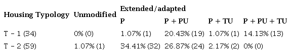 A detailed observation of the extensions revealed that residents mostly followed the designers’ recommendations for the materials of the extensions only using lightweight materials considering the structural characteristics of the houses. Although the housing extensions could be easily removed or replaced, from the residents’ perspective these additions are permanent. Additionally, there are other types of additions which are temporary as they are not intended to be used in the long term. Such temporary extensions are gazebos or tents in front of the houses, and tarpaulin-covered backyards. In table 1 it is summarized the number of households that built certain kind of extensions. In principle, from the 93 households, only one has not modified its house. The other 92 houses show a different degree of extension and modification.