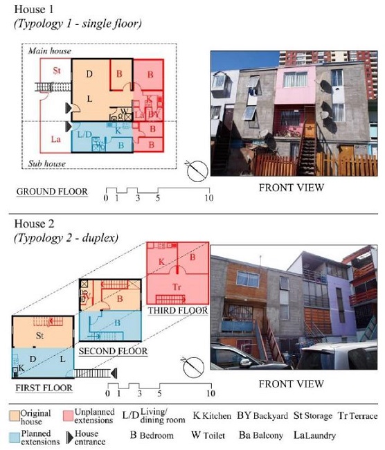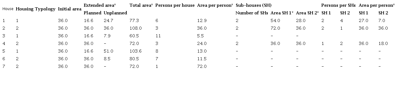 The unregulated and unknown housing progression is evidenced by the larger area occupied and more complexities in the adaptation of the houses which are the result of changing residents’ needs, aspirations, resources and capacities. Among the main priorities of Elemental architects were avoiding the degradation of the settlement and the safety in the construction of extensions. However, they also recognized the impossibility to control the houses’ extensions. Table 2 below gives an insight of resident’s capacities to expand their houses and the importance to focus on the extensions as these can double the original housing provided. Residents’ agency has been evidenced although potential risks for the residents’ wellbeing also emerged.