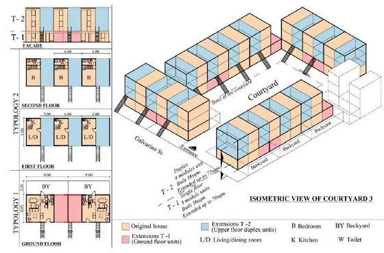 Quinta Monroy is a complex of 93 housing units organized in four courtyards aiming to promote community interaction and keep previous neighbors’ affinities (Figures 1 and 2). The housing units are modular, each module is 3x6m. There are two housing typologies. On the ground floor, 34 housing units of typology 1, each of them occupies three modules (54 sqm), two built and one to be completed. The lower units have a backyard of 27sqm that according to Elemental’s expectations could be occupied up to 60% to achieve a total are for an extended house of 70sqm (Figure 2). Typology 2 (59 units) are duplex units built on top of units of typology 1. In the land occupied by one unit of typology 1, 1.5 units were built upstairs. Each duplex unit has two modules built (36 sqm) and two more modules to be extended to obtain a complete house of 72sqm (see Figure 2). Thus, Elemental claimed that they optimized the land building 2.5 houses in 54sqm.