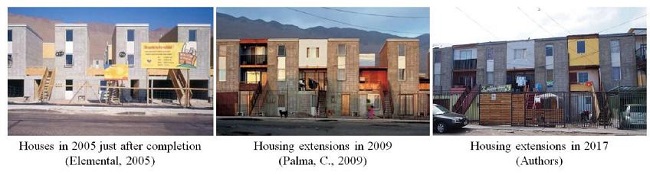 Elemental (Iacobelli & Aravena, 2008) envisaged some limitations for the self-built extensions through guidelines provided and defining the area of the initial and extended houses (Figure 2), and the use of lightweight materials for the self-built extensions. Designers predicted ‘self-construction as customization, not deterioration’ (Iacobelli & Aravena, 2008) through the construction of the houses on the front edge of the lot, claiming that this would guarantee the quality of the urban front once the extensions are built. Additionally, building the half of the house that the families would never be able to achieve might guarantee the safety of the whole house of the intercalated open spaces to be filled by the residents. However, the reality of housing extensions might not necessarily follow the designers’ plans, especially in the long-term. Figure 3 shows the evolution of the houses in Quinta Monroy, from the completion of the construction in 2005 (left), four years after the families moved in the house (center), and twelve years after the beginning of inhabitancy (right).